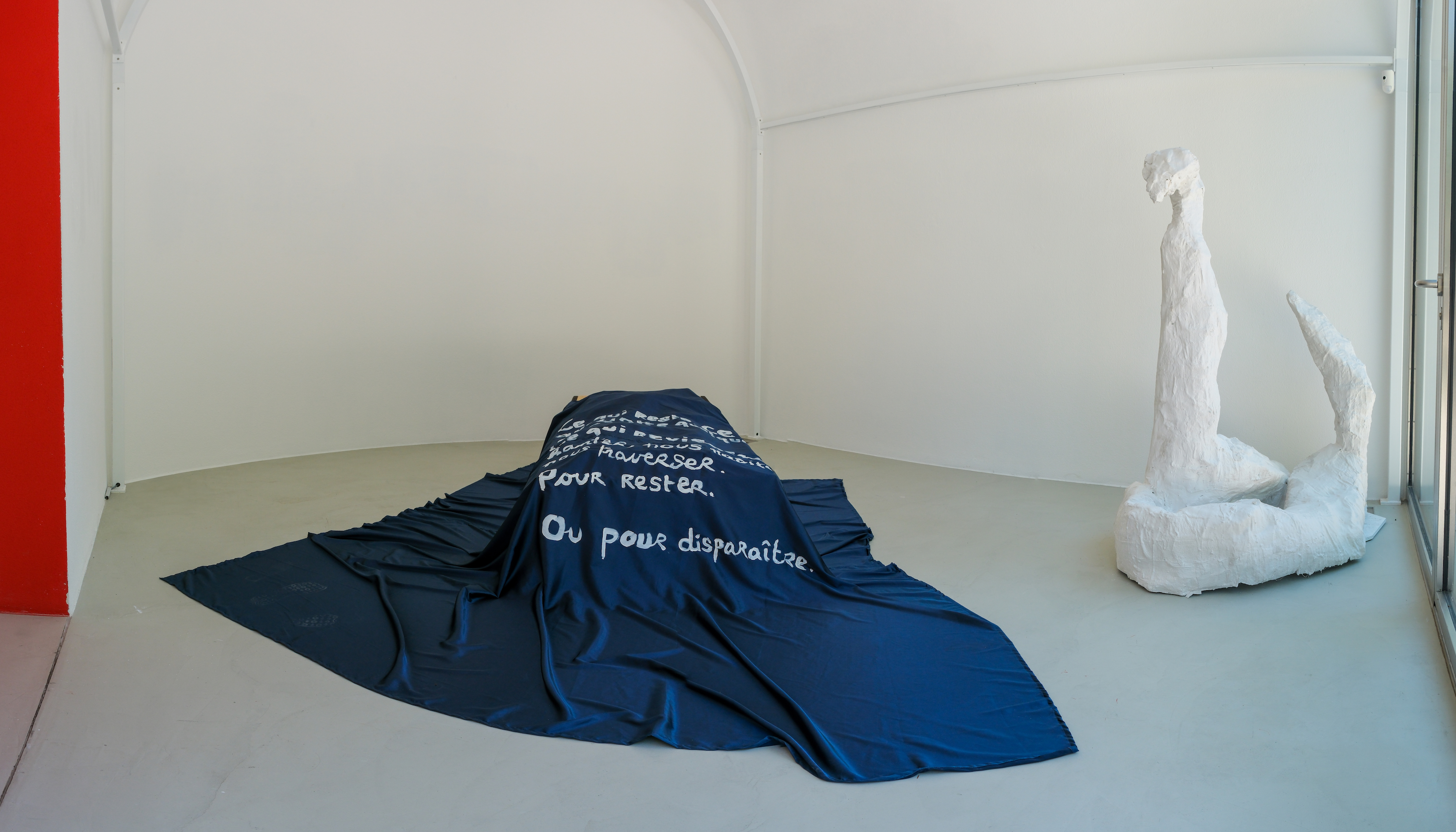 Cet espace hybride, entre sanctuaire et chambre, abrite un lit solitaire recouvert d’un drap bleu marine en satin. Une phrase y est inscrite, comme une prise de note rapide, une incantation contre le mauvais sort, l’angoisse qui nous traque jusque dans l’intime.