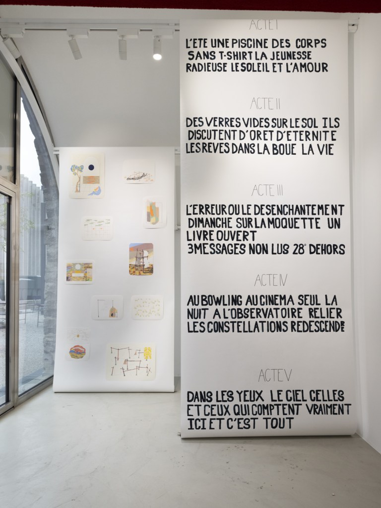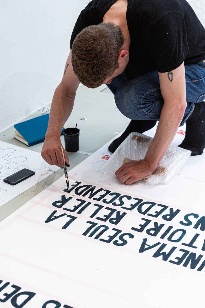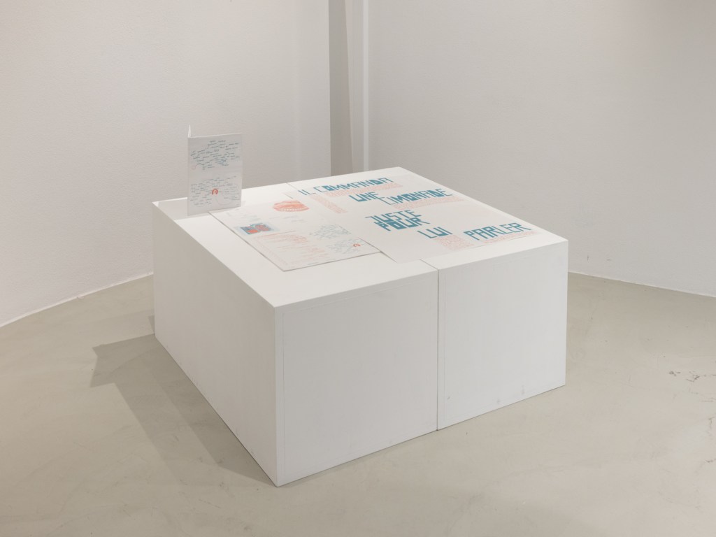 Une réflexion est portée autour de l’écriture qui, à contrario de l’image, ne transmet pas une information directe au premier coup d’œil. Travailler alors sur l’écriture visuelle, c’est-à-dire dans sa forme, sa mise en page, son choix de mots et son existence dans l’espace.